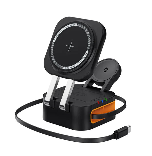3 in 1 Foldable Wireless Charging Station Fast Charger Stand with Retractable Cable for iWatch, iPhone 16/15/14 Series, AirPods