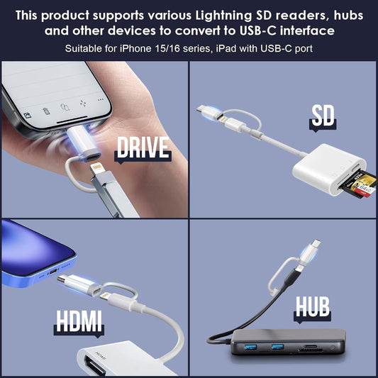 2 Pack Lightning to USB-C Data Conversion Adapter, Multiple Lightning Interface Device Conversions Suitable for iPhone 15 16 (Read Details Before Purchasing) SD Card Reader, Camera Converter