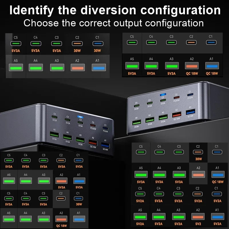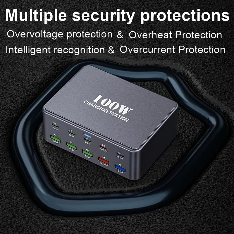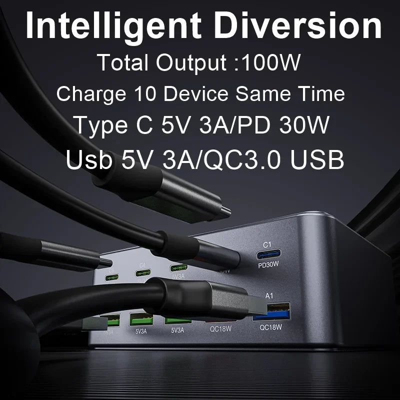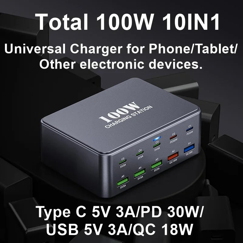 100W Universal Multi USB Type C Charger 10 Port USB QC3.0 PD Charging Station For Ipad Iphone 16 15 14 13 Pro Max Samsung Tablet