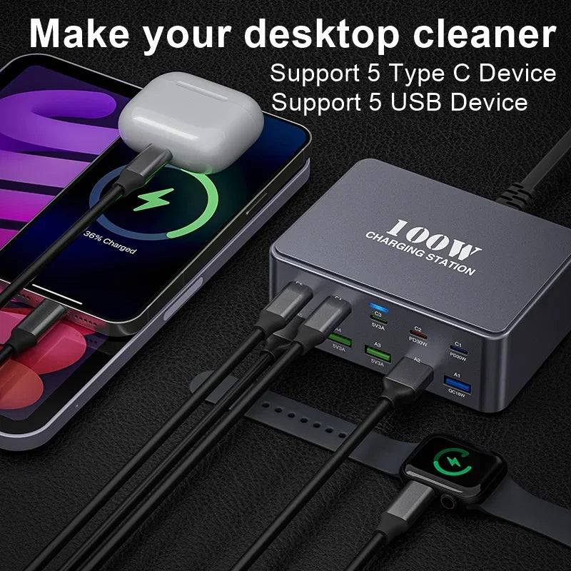 100W Universal Multi USB Type C Charger 10 Port USB QC3.0 PD Charging Station For Ipad Iphone 16 15 14 13 Pro Max Samsung Table