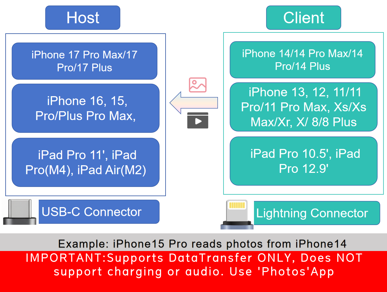 To ensure a stable link, please connect the connector marked "Host" (USB-C) to the source device (e.g., iPhone 15/16 or iPad Pro) to initiate transfer. This directional design ensures proper data recognition between the USB-C host and Lightning target.